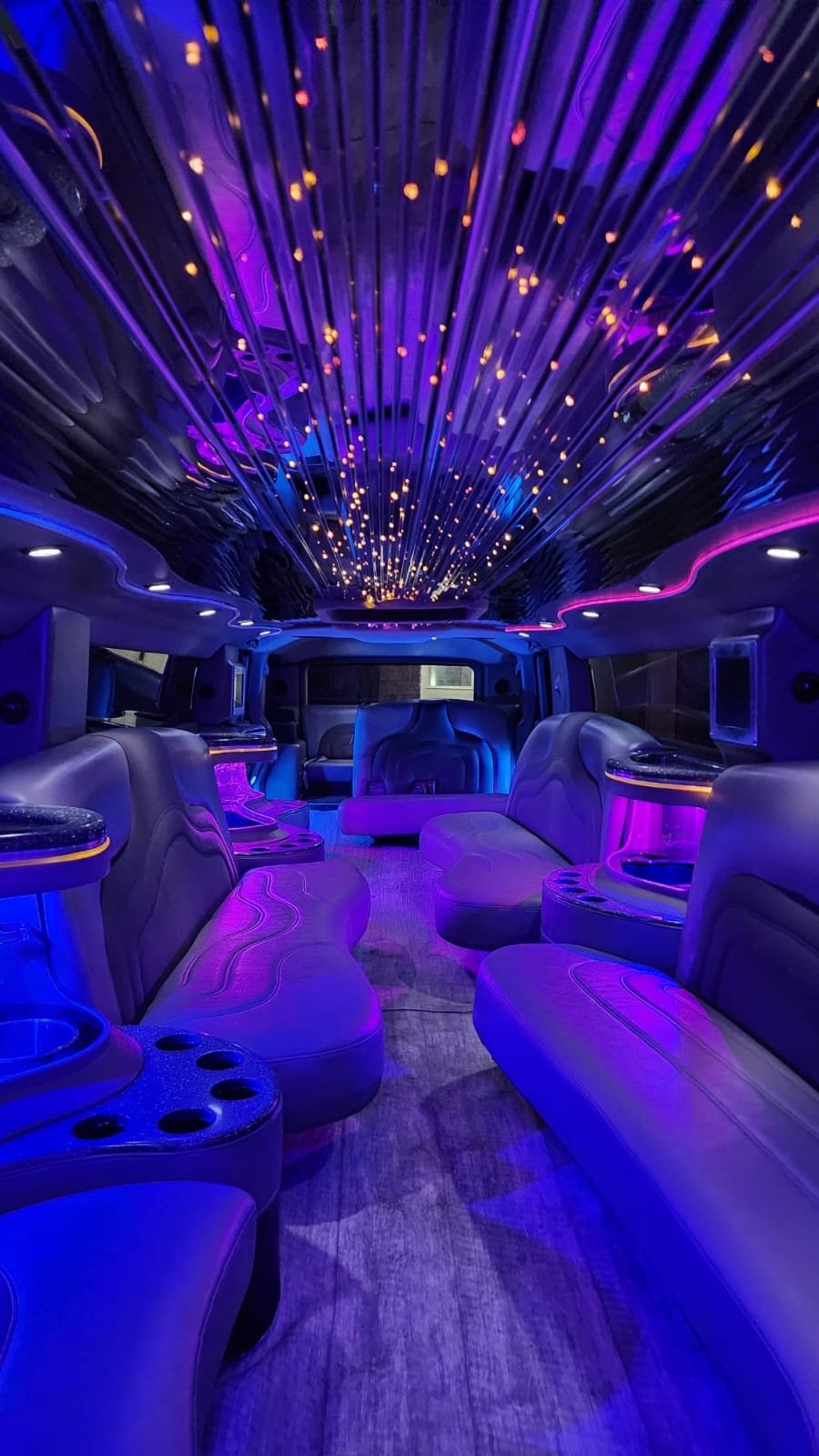 Step inside, and you are transported into a private VIP lounge. With a raised roof and extra-wide cabin, it offers unparalleled spaciousness for larger groups. The interior is decked out with wraparound leather seating, state-of-the-art sound systems, and a dazzling lighting display that includes fiber optics, lasers, and mirrored ceilings. Whether it’s a wedding, prom, or a wild bachelor/bachelorette party, the Hummer Limo ensures the party starts the second you close the door.